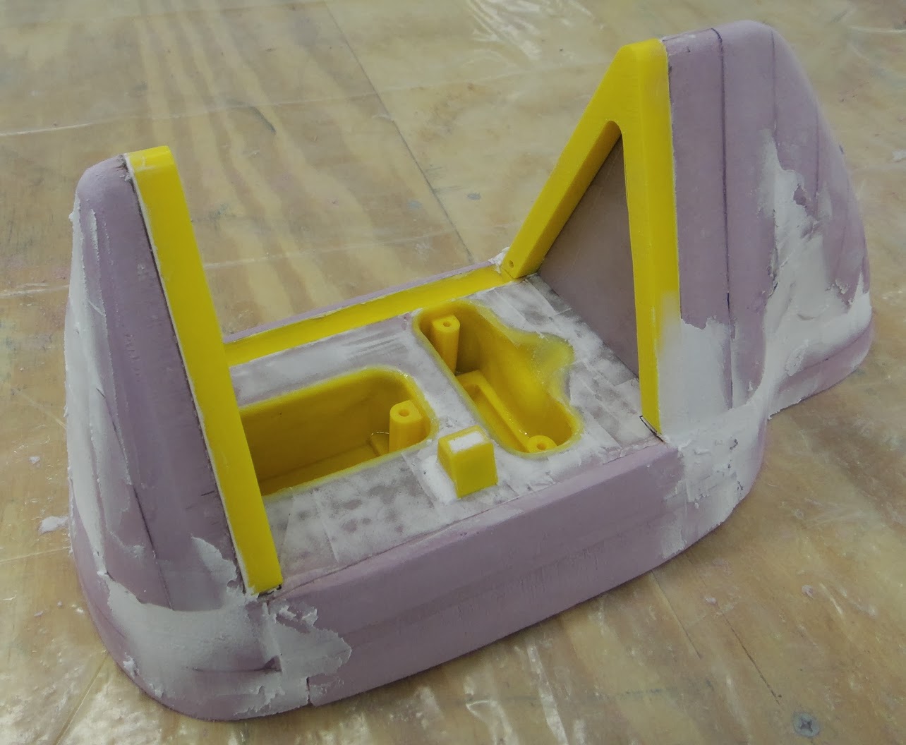 In this photo you can see the additional foam that was added to the assembly along with the shaping that was needed for the two inches of base foam that I started with. I had to keep checking this assembly with the body of the velomobile so that I could get the proportions as close as possible for shaping.